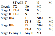 DISCUSSION: The TNM staging system for carcinoma of the lung provides a consistent, reproducible description of the anatomic extent of disease at the time of diagnosis. In the TNM system, T represents the primary tumor and numerical suffixes describe increasing size or involvement; N represents regional lymph nodes with suffixes to describe levels of involvement; and M designates the presence or absence of distant metastases.
