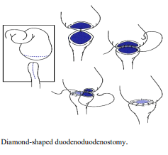 Generally, bypass of the obstructing lesion is the best approach regardless of whether an atresia or annular pancreas is responsible. Division of an annular pancreatic band is inappropriate for two reasons: 1) The duodenum is virtually always atretic in addition. 2) Division of this pancreatic tissue necessarily divides the accessory pancreatic duct within it creating the real possibility of a pancreatic fistula. Generally, the construction of a duodenostomy that minimizes the length of defunctionalized duodenum is preferred. The procedure generally employed is a diamond-shaped duodenostomy. Simple duodenojejunostomy without a Roux-en-Y is occasionally necessary for lesions in the distal duodenum.