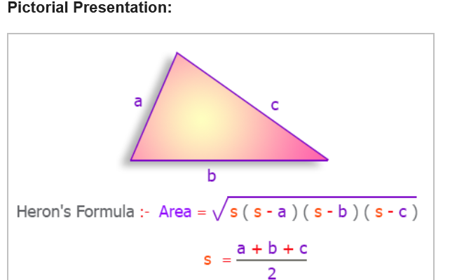 cout << "\n\n Find the area of any triangle using Heron's Formula :\n";