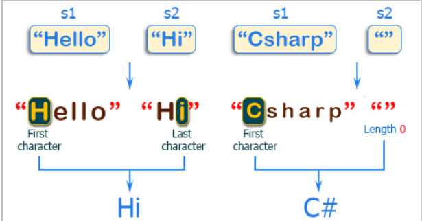 Write a C++ program to create a new string taking the first character from a given string and the last character from another given string. If the length of any given string is 0, use '#' as its missing character
