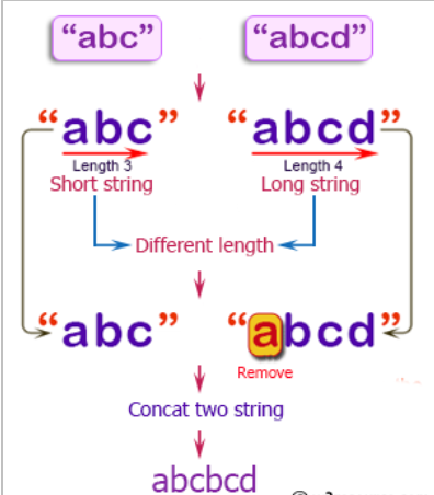 Write a C++ program to concat two given strings. If the given strings have different length remove the characters from the longer string