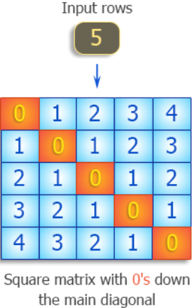 Write a program in C++ to produce a square matrix with 0's down the main diagonal, 1's in the entries just above and below the main diagonal, 2's above and below that, etc