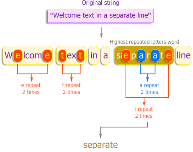 Write a C++ program to find a word in a given string which has the highest number of repeated letters