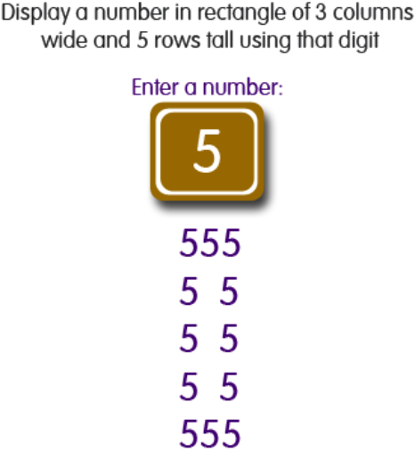 Write a C# program that takes a number as input and then displays a rectangle of 3 columns wide and 5 rows tall using that digit