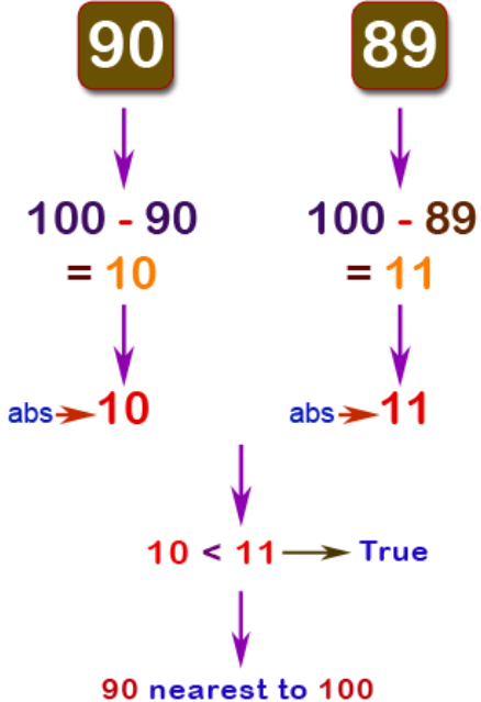 Write a C# Sharp program to check which number nearest to the value 100 among two given integers. Return 0 if the two numbers are equal
