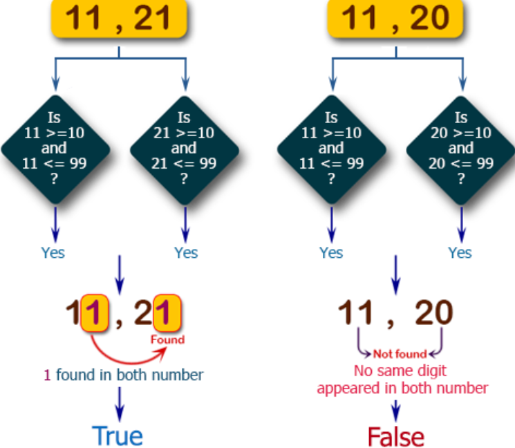 Write a C# Sharp program to check two given integers, each in the range 10..99. Return true if a digit appears in both numbers, such as the 3 in 13 and 33