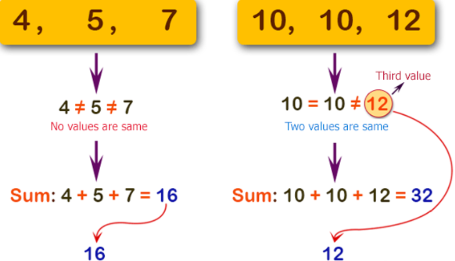 Write a C# Sharp program to compute the sum of three given integers. If the two values are same return the third value