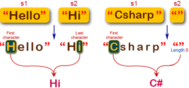 Write a C# Sharp program to create a new string taking the first character from a given string and the last character from another given string. If the length of any given string is 0, use '#' as its missing character