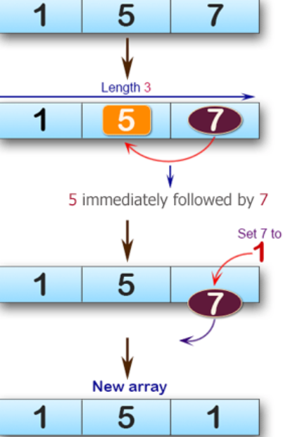 Write a C# Sharp program to check a given array of integers, length 3 and create a new array. If there is a 5 in the given array immediately followed by a 7 then set 7 to 1
