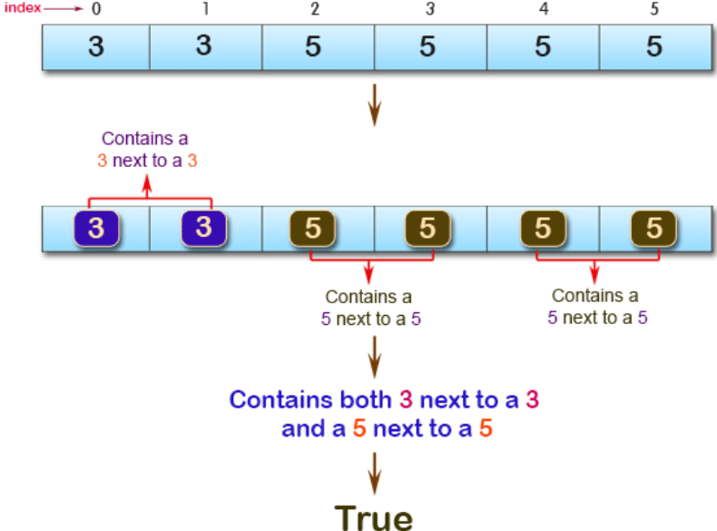 Write a C# Sharp program to check if an array of integers contains a 3 next to a 3 or a 5 next to a 5 or both