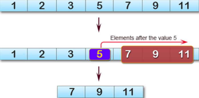 Write a C# Sharp program to create a new array taking the elements after the element value 5 from a given array of integers