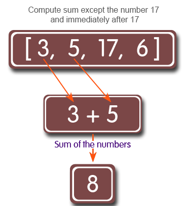 Write a Ruby program to compute the sum of the numbers of a given array except the number 17 and numbers that come immediately after a 17. Return 0 for an empty array.