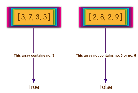 def check_array(nums) noThree = true, noFive = true; i = 0; while i < nums.length && (noThree || noFive) if(nums[i] == 3) noThree = false elsif(nums[i] == 5) noFive = false end i = i + 1 end return (noThree || noFive) end print check_array([3, 7, 3, 3]),"\n" print check_array([2, 8, 2, 9]),"\n" print check_array([3, 8, 5, 9]),"\n"