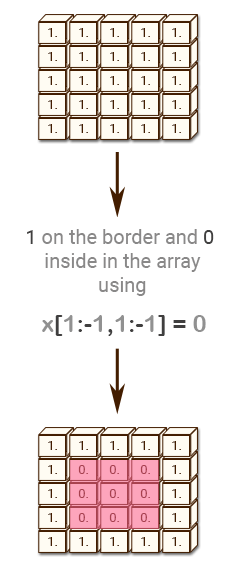 Original array: [[ 1. 1. 1. 1. 1.] [ 1. 1. 1. 1. 1.] [ 1. 1. 1. 1. 1.] [ 1. 1. 1. 1. 1.] [ 1. 1. 1. 1. 1.]] 1 on the border and 0 inside in the array [[ 1. 1. 1. 1. 1.] [ 1. 0. 0. 0. 1.] [ 1. 0. 0. 0. 1.] [ 1. 0. 0. 0. 1.] [ 1. 1. 1. 1. 1.]]
