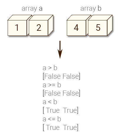 Array a: [1 2] Array b: [4 5] a > b [False False] a >= b [False False] a < b [ True True] a <= b [ True True]