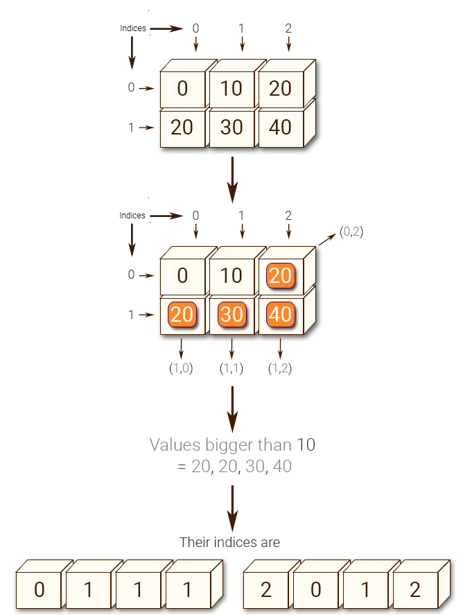 Original array: [[ 0 10 20] [20 30 40]] Values bigger than 10 = [20 20 30 40] Their indices are (array([0, 1, 1, 1]), array([2, 0, 1, 2]))