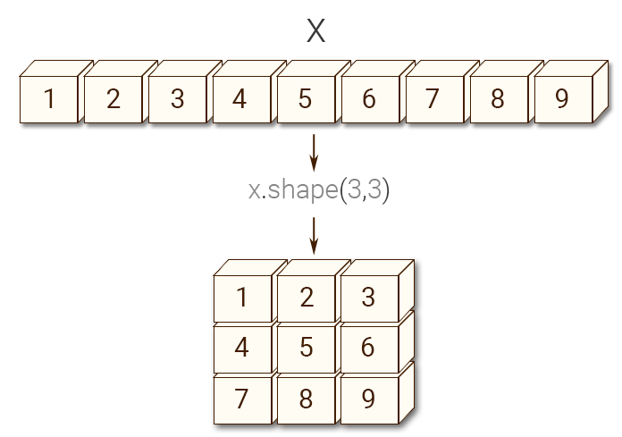 import numpy as np x = np.array([1, 2, 3, 4, 5, 6]) print("6 rows and 0 columns") print(x.shape) y = np.array([[1, 2, 3],[4, 5, 6],[7,8,9]]) print("(3, 3) -> 3 rows and 3 columns ") print(y) x = np.array([1,2,3,4,5,6,7,8,9]) print("Change array shape to (3, 3) -> 3 rows and 3 columns ") x.shape = (3, 3) print(x)