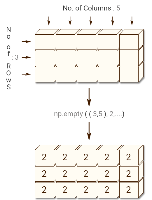 import numpy as np #using no.full x = np.full((3, 5), 2, dtype=np.uint) print(x) #using no.ones y = np.ones([3, 5], dtype=np.uint) *2 print(y)