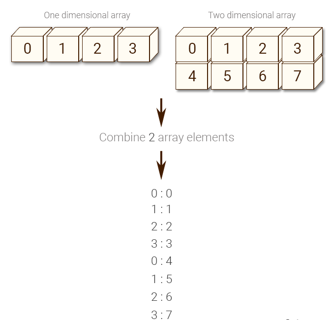 One dimensional array: [0 1 2 3] Two dimensional array: [[0 1 2 3] [4 5 6 7]] 0:0 1:1 2:2 3:3 0:4 1:5 2:6 3:7