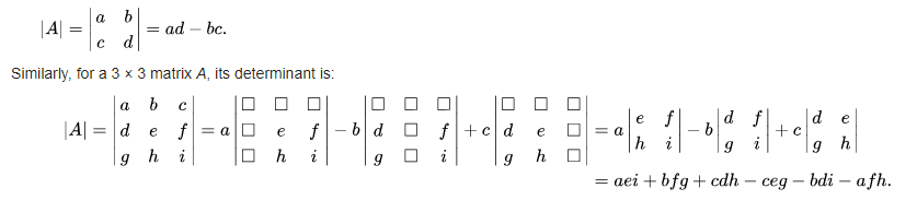 From Wikipedia: In linear algebra, the determinant is a value that can be computed from the elements of a square matrix. The determinant of a matrix A is denoted det(A), det A, or |A|. Geometrically, it can be viewed as the scaling factor of the linear transformation described by the matrix.