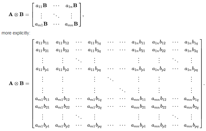 If A is an m × n matrix and B is a p × q matrix, then the Kronecker product A ⊗ B is the mp × nq block matrix: