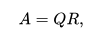 where Q is an orthogonal matrix (its columns are orthogonal unit vectors meaning {\displaystyle Q^{\textsf {T}}Q=QQ^{\textsf {T}}=I} {\displaystyle Q^{\textsf {T}}Q=QQ^{\textsf {T}}=I}) and R is an upper triangular matrix (also called right triangular matrix). If A is invertible, then the factorization is unique if we require the diagonal elements of R to be positive.